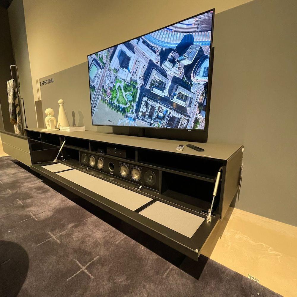 Ruime, hangende TV-kast met een strak en modern design. Aan de rechterzijde bevindt zich een klep met speakerdoek en een geïntegreerd Spectral soundsysteem voor een hoogwaardige geluidservaring. De linkerzijde beschikt over een ruime lade met twee vakken voor extra opbergruimte. Het meubel is uitgevoerd in stijlvol granietkleurig glas en heeft greeploze kleppen en lades voor een minimalistische en elegante uitstraling.